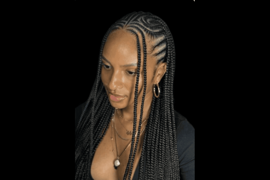 The Asymmetrical Stitch Goddess Braid is a bold and creative take on traditional goddess braids, featuring thick, raised braids that are styled in a unique, off-centre pattern resembling “stitches” across the scalp.